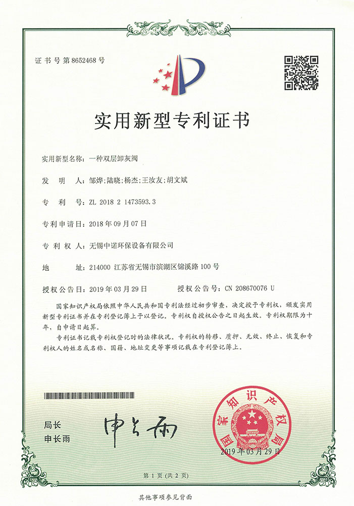一種雙層卸灰閥實用新型專利證書